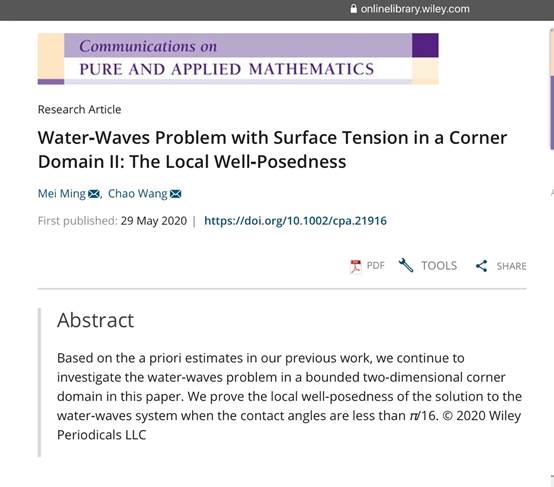 近日,TapTap点点明梅副教授与合作者的论文“Water waves problem with surface tension in a corner domain II: the local well-posedness”在国际顶尖数学期刊Communications on Pure and Applied Mathematics(CPAM)上在线发表。CPAM由国际最负盛名的应用数学研究所之一—柯朗数学科学研究所(Courant Institute of Mathematical Sciences)于1948年创刊,发表纯粹与应用数学、数学物理等研究领域具有突破性的一流研究成果。该杂志每年刊载不到百篇论文,在数学界有极高的知名度和影响力,属于数学类最顶尖的期刊之一。例如,CPAM曾在2013年被ISI Journal Citation Reports评价为302种入选数学类刊物第一名。