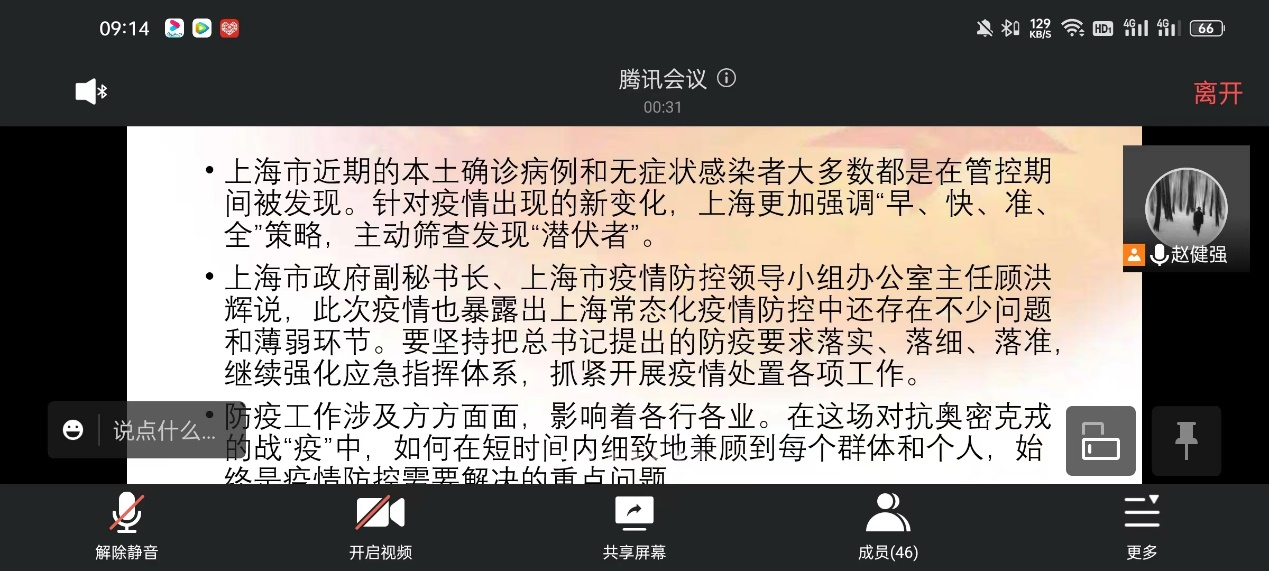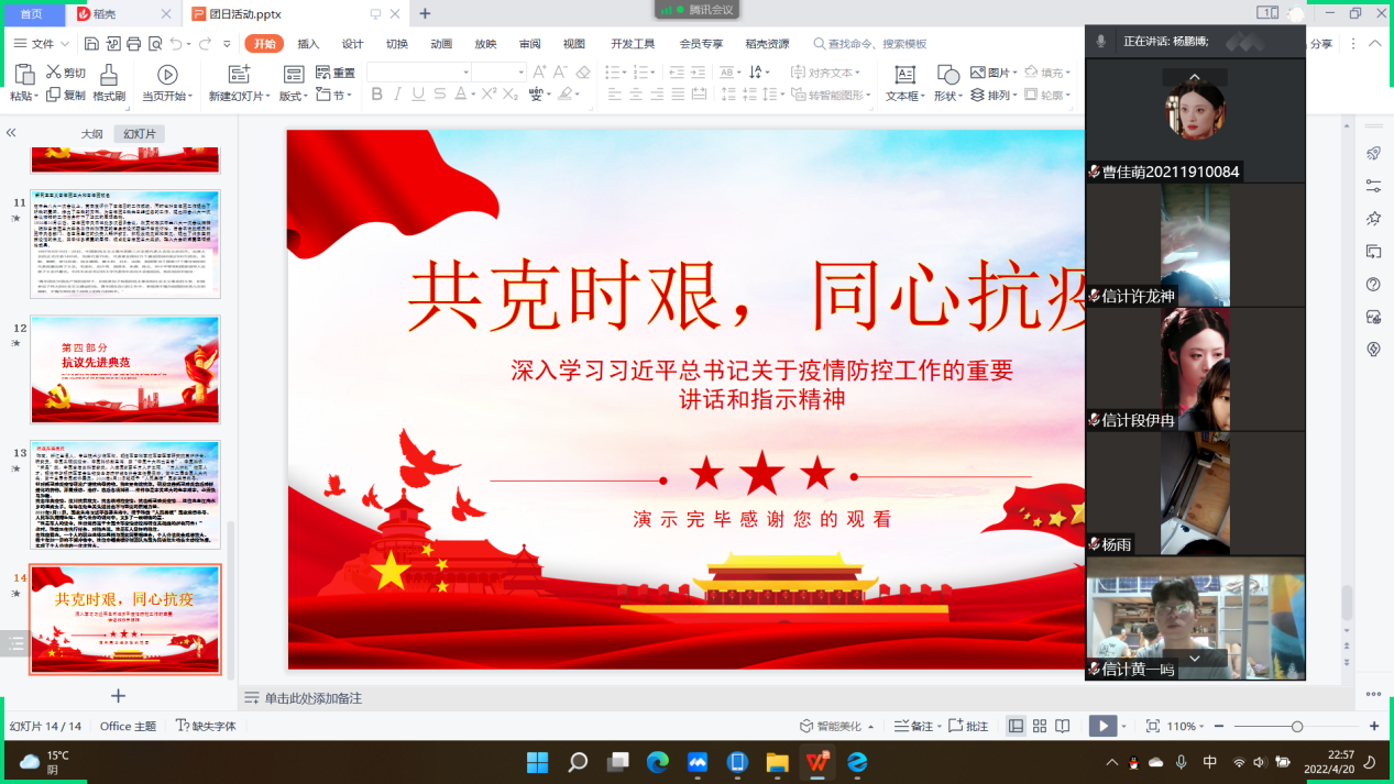依照疫情防控要求,数统公司四月主题团日活动以线上会议的形式开展。统计学专业2021级团支部支书,向同学们展示了当前国内疫情最新数据消息,简单介绍了当前国内防疫形式,希望同学们都能了解公司疫情防控相关文件,加强自身防护意识。会议结束后,员工们对我国新冠肺炎疫情防控的近况有所了解,掌握了新冠肺炎疫情防控的相关知识。