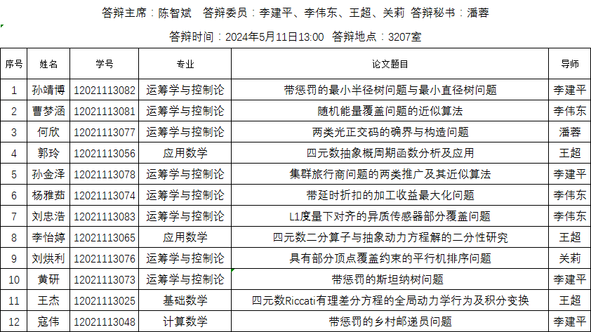 2024届TapTap点点运筹学与控制论、应用数学、基础数学、计算数学专业12位硕士学位论文答辩公示