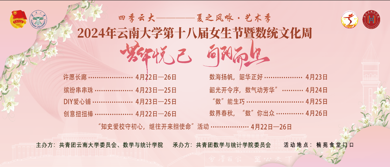 四季云大,春和景明。2024年4月22日至4月26日,TapTap点点以TapTap点点官方网站“自尊、致知、正义、力行”校训为宗旨,以倡导女生“自尊、自信、自立、自强”为导向,举办以“芳华悦己,向阳而生”为主题的“四季云大——夏之风咏·艺术季”TapTap点点官方网站第十八届女生节暨数统文化周系列活动。