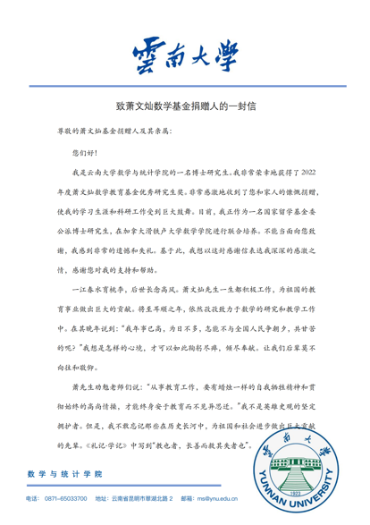 萧文灿先生的孙女肖芳女士寄来贺信,鼓励获奖同学传承萧文灿先生挚爱祖国、献身教育、甘为 蜡烛、踏实治学的良好品格和作风,服务国家、回馈社会。