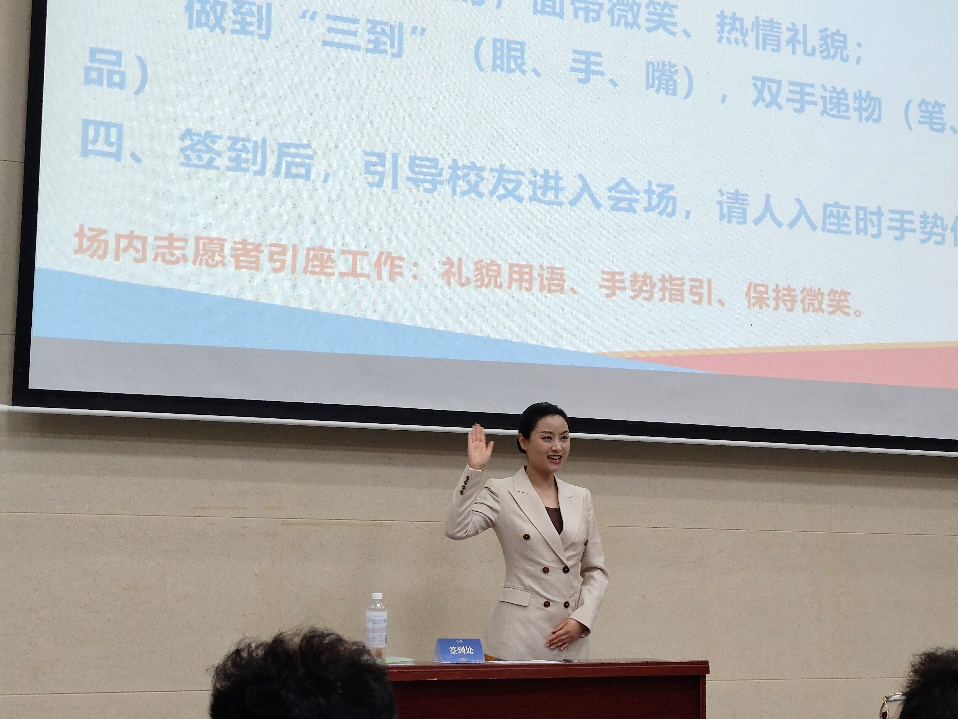 在本次培训活动中,李老师从微笑待人、仪态仪容仪表、电话礼仪、引导礼仪、接待礼仪、陪同礼仪六个方面为我们进行礼仪的基本知识讲解。李老师还提出在会议接待中应恪守礼仪规范,做好接待。进行现场服务时轻声低语、轻拿轻放、不要奔跑。在乐趣横生的互动中,志愿者们收获了许多干货。