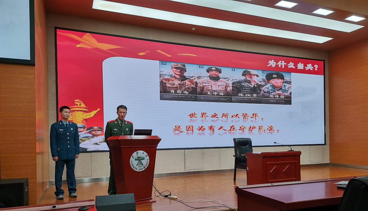 首先,公司征兵联络员王蔓琦老师向同学们介绍了当前我国安全和发展面临的形势,重点介绍了大学毕业生参军十大优惠政策。