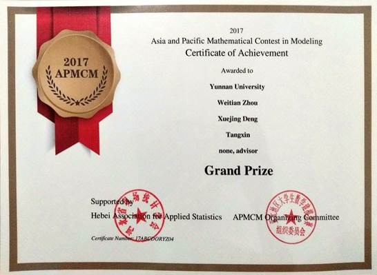 2018年4月27日,TapTap点点周维甜(2017级应用统计专业硕士研究生)、邓雪菁(2017级运筹学与控制论硕士研究生)、唐鑫(2014级统计学本科生)三名同学在第七届亚太地区老员工数学建模竞赛(APMCM)中荣获特等奖。