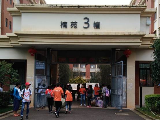 早上7点整,工作人员和志愿者就已经全部到位,迎新人员穿着公司统一的服装在各个接待点随时准备迎接新生的到来,热情地接待每一位新生,帮助他们拿行李,带领他们到报到点注册,领取校园卡以及相关资料,带他们到宿舍领取钥匙,入住宿舍。虽然天空下着雨,但全体工作人员和志愿者的热情依旧。