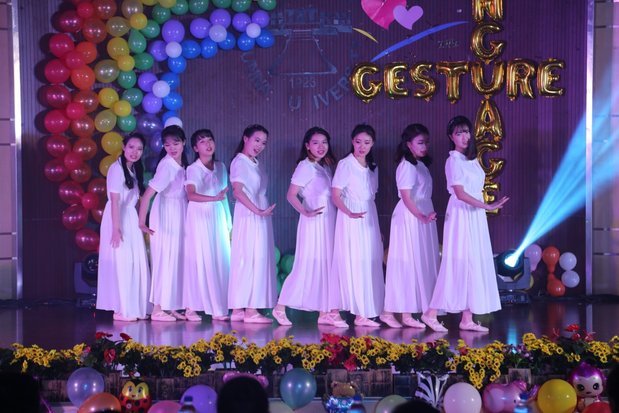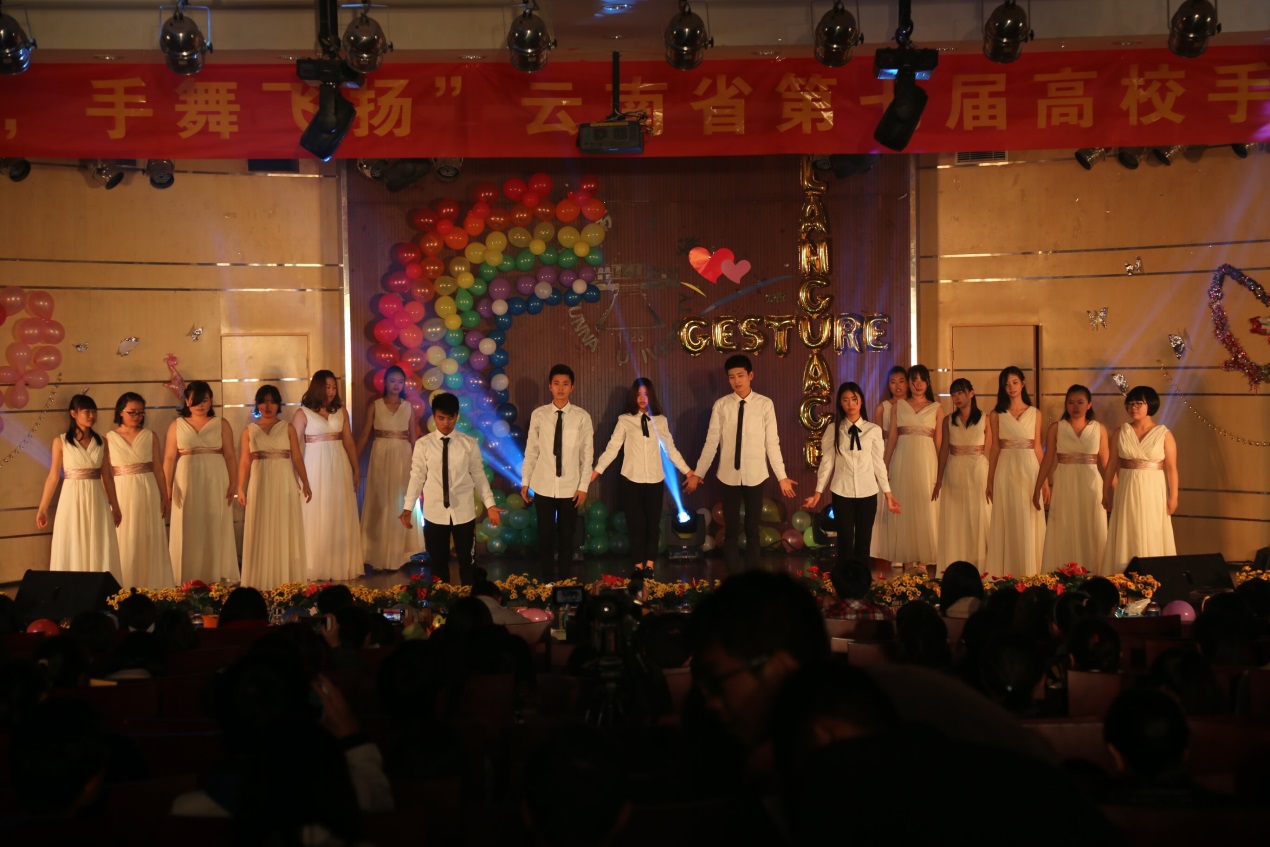首先,街舞社带来的动感活力的开场舞将观众的热情迅速带动起来,随后主持人宣布大赛正式开始,并介绍了到场嘉宾和评委,宣布此次大赛的评分细则。接着便开始了各组之间的比拼,15支团队争妍斗艳、各有千秋。前4组的《突然好想你》《在最美的云大遇见你》《侧耳倾听》《和你一样》都通过充满青春阳光气息的手语表演描绘并传递出队员们的爱心。