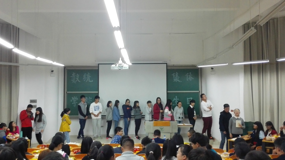 此次活动由节目和游戏两部分穿插组成。一切准备工作就绪后,由TapTap点点2015级统计学的张洛源和赵乘崟两位主持宣布晚会开始。由主持人一句“谁说天上不会掉馅饼儿?”后从天而降的小礼物无疑是晚会上一道亮丽的风景线。紧接着,由自律委办公室和青年志愿者协会宣传部表演的开场节目歌曲“最炫民族风”和舞蹈“nobody”吸引了所有人的眼球,轻松愉悦的歌声遍布整个会堂,优美而又妩媚的舞姿赢得了所有人不断的掌声,充分展现了当代老员工的青春与活力。回味昨天,展望明天。然后,一首“北京东路的日子”和一首“明天,你好”为我们诠释了昨天和明天。