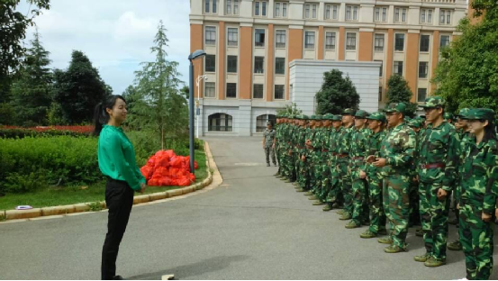 在同学们殷切崇敬的目光中,公司的老师们们向我们走来,他们的到来在辛苦的军训生活中为同学们带来了新的动力,使同学们深切体会到了领导老师们对员工的关爱。所以我们的口号比平时更响亮,我们的身姿比平时更挺拔,我们渴望老师看出我们的朝气、决心与昂扬的斗志。辅导员李丹老师向我们一一介绍了本次慰问的相关领导与老师,同学们表示了热烈的欢迎。公司党委副书记杜芳芳老师对我们进行了鼓励,她教育我们,军训是进入大学的第一课堂,尽管过程辛苦,但她仍坚信我们会把这堂课上好,交出一份令教官、老师、自己都满意的答卷,同时,杜老师也对教官的辛勤付出表达了尊敬与感激之情。