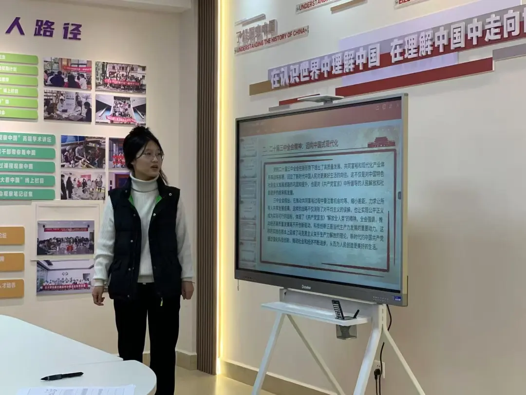 陈叶萱小组结合党的二十届三中全会精神分享了自己阅读《习近平的七年知青岁月》和《共产党宣言》的感触,并讲述了“作为新时代的青年人,我们应该发挥自己的智慧和力量,为国家的繁荣富强贡献自己的青春和热血;应该深入基层,了解国家的实际情况,通过实践增长才干,为国家的建设和发展提供有力的支持;应该在困难和挑战中锻炼自己,培养坚韧不拔的意志和品质,为实现个人的梦想和国家的目标而不懈努力;应该通过投身于国家的发展事业,在奉献中收获成长和进步,实现个人价值与社会价值的统一”。