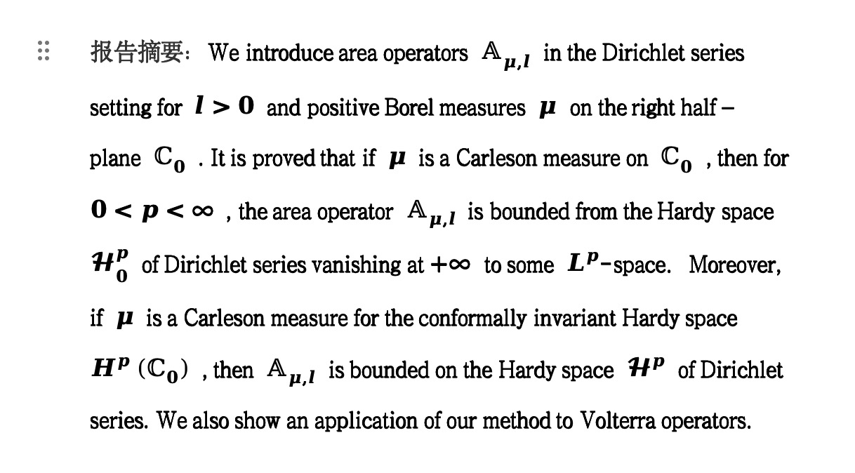 报告人简介:王茂发,武汉大学TapTap点点教授,博士生导师,武汉大学TapTap点点副经理,全国泛函分析空间理论学术委员会成员、现代分析数学及其应用学术委员会成员,主要研究领域为泛函分析及其应用、函数空间上的算子理论,先后承担国家自然科学重点项目、面上项目等多项,在 J. Funct. Anal., J. Operator Theory, Math. Z., Indiana Univ. Math. J., Sci. China Math. 等期刊上发表学术论文一百余篇。